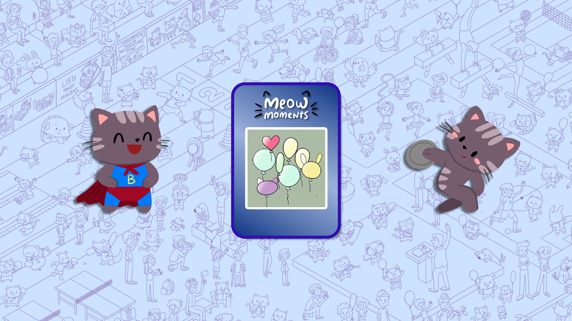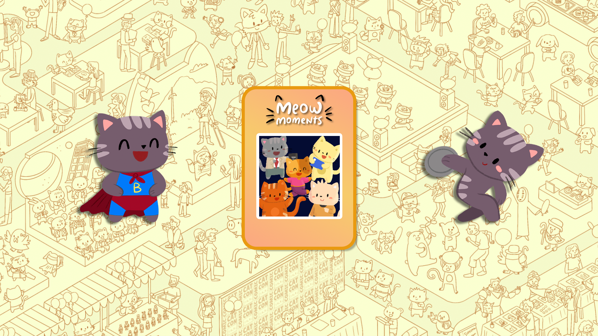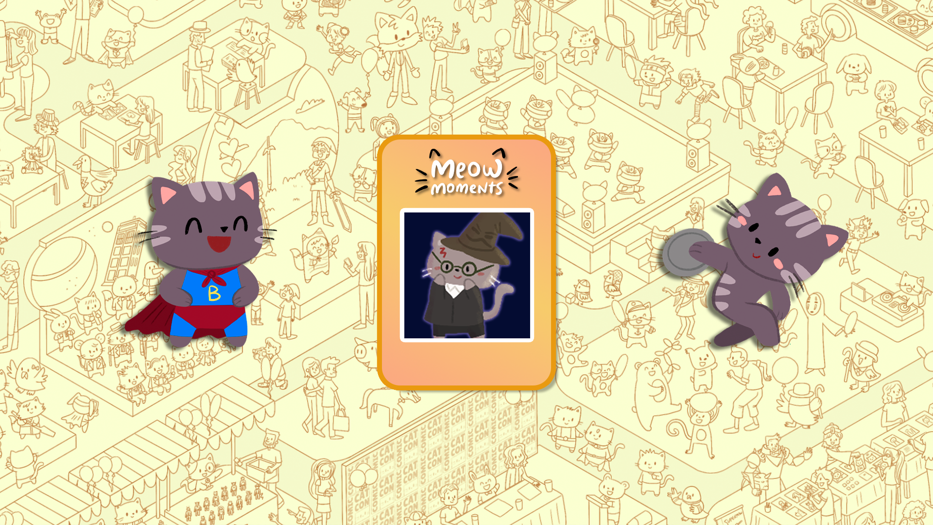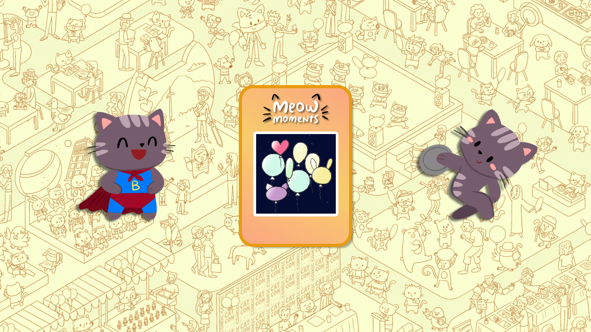 Rejoignez d'adorables chats dans des scènes festives ! Trouvez des amis félins et éclatez des ballons en explorant Olympicats, un événement sportif mondial palpitant, et Comic Cat Con, une excitante convention de culture pop.
