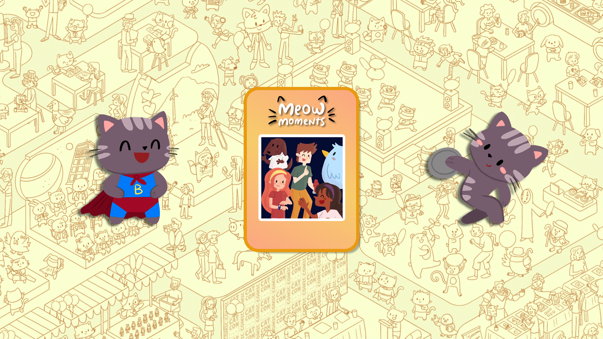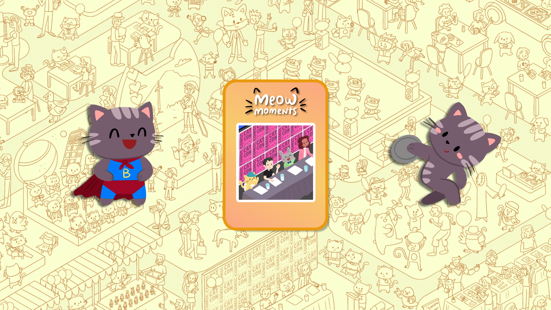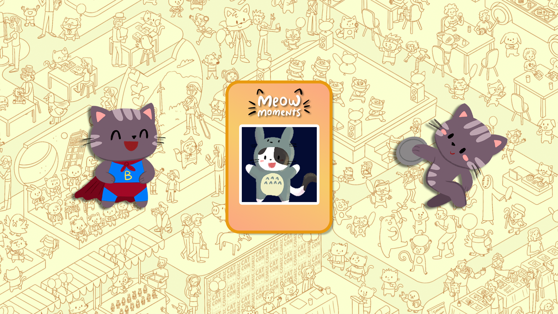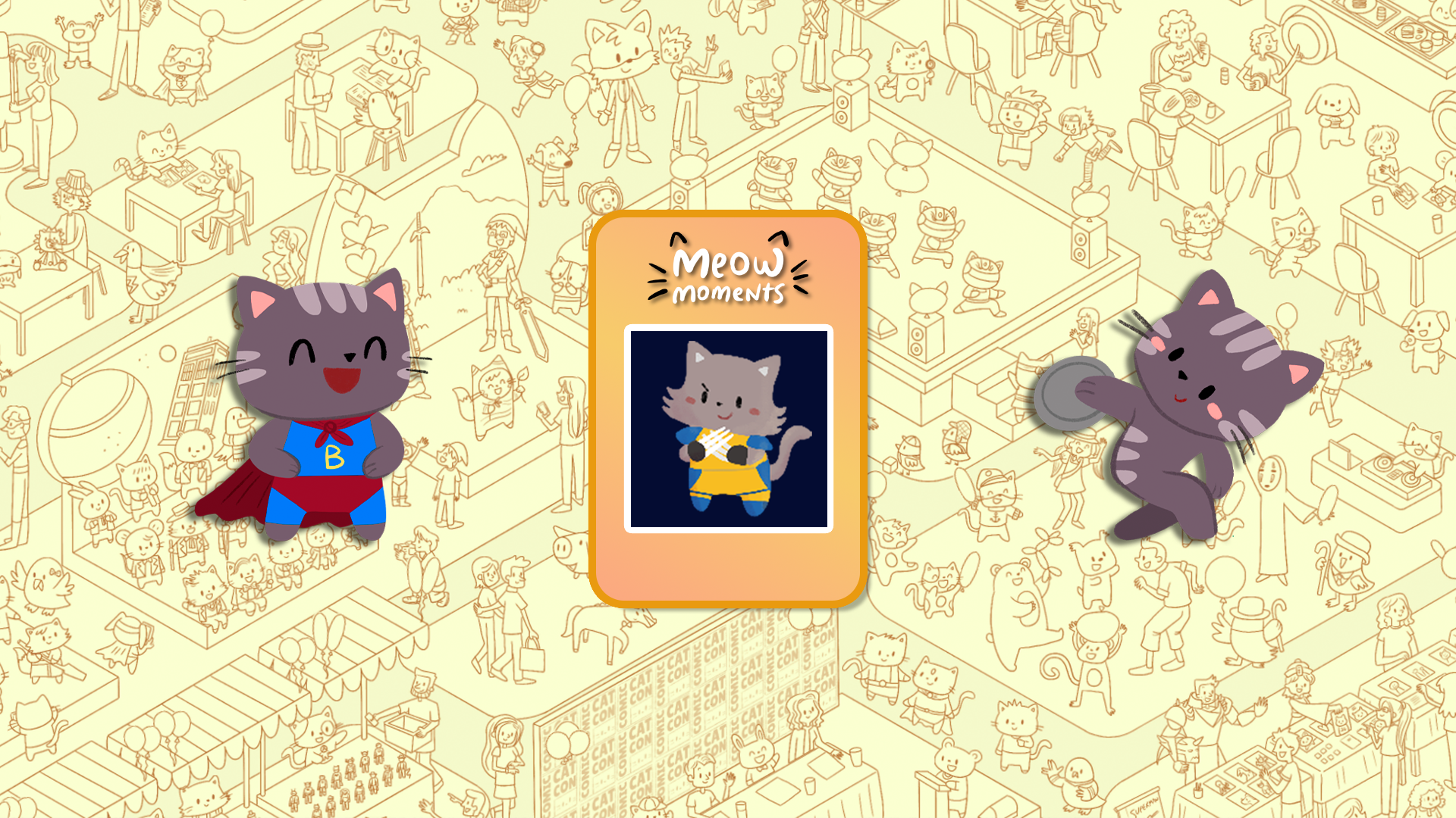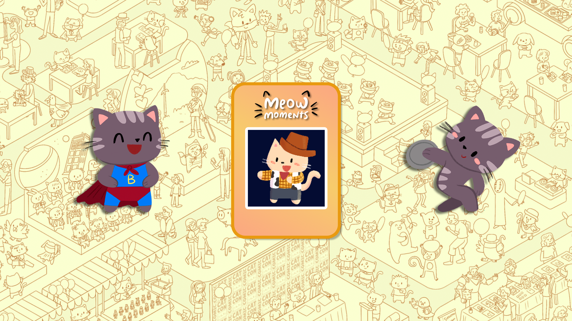 Rejoignez d'adorables chats dans des scènes festives ! Trouvez des amis félins et éclatez des ballons en explorant Olympicats, un événement sportif mondial palpitant, et Comic Cat Con, une excitante convention de culture pop.